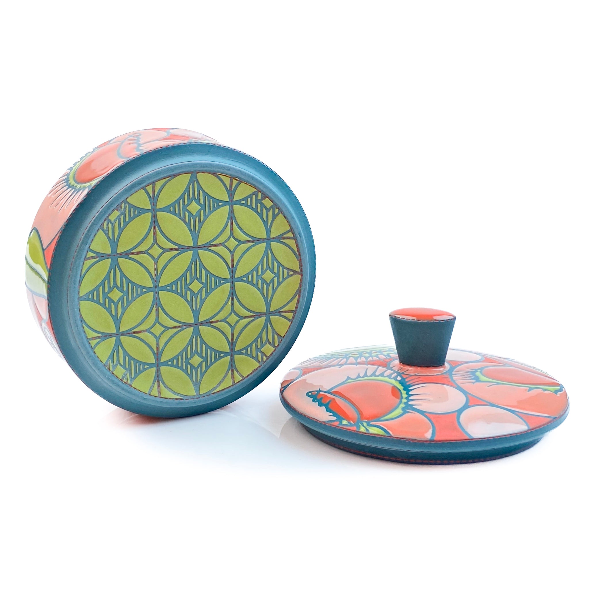 stoneware, colored slip, underglaze & glaze.